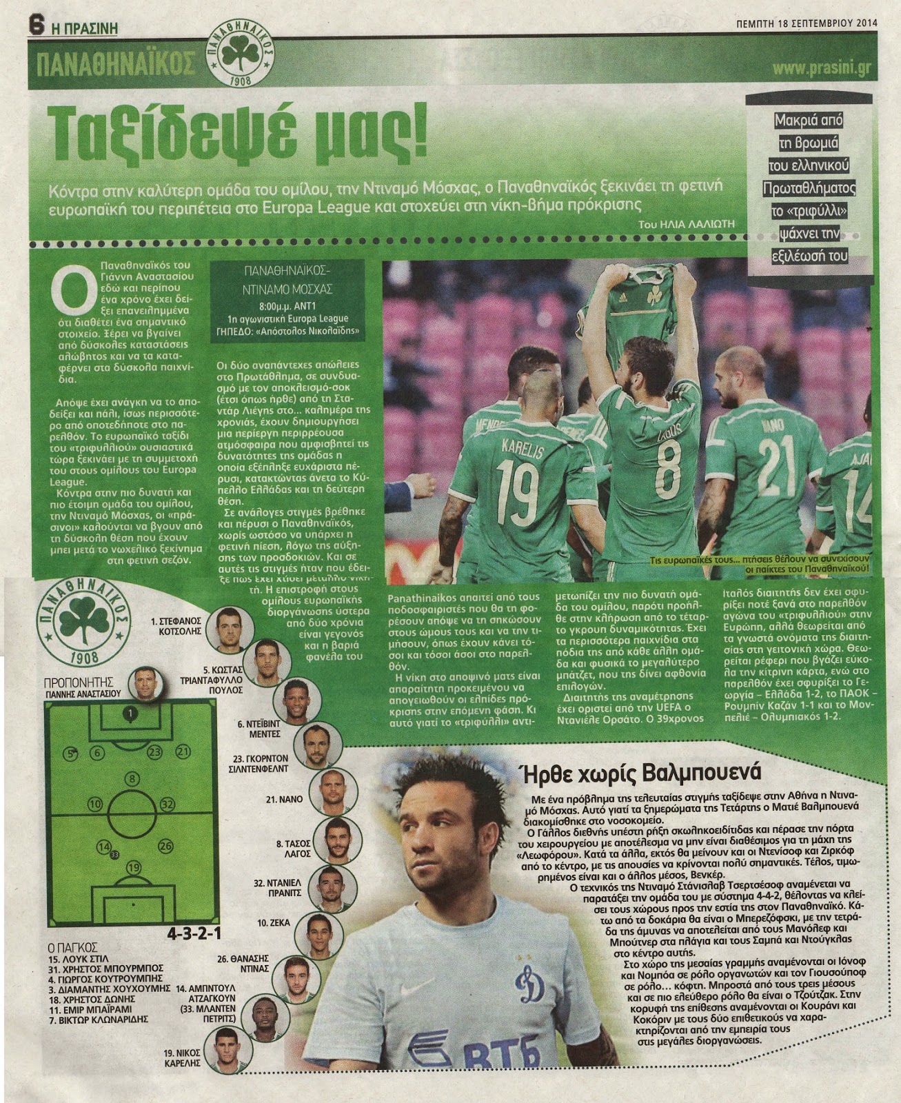 В принципе, для консерваторов, есть отличный вариант, если оставлять пустое место в папке им очень не хочется. Кое-что в бумажном виде Панатинаикос все же сделал. Это клубная газета, которую я также с огромным удовольствием приобрел себе в коллекцию. На первой странице названия встречающихся команд, внутри представление матча с расстановкой программ. В общем, вещь далеко не левая, а вполне себе официальная...